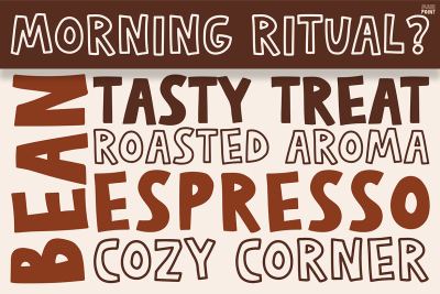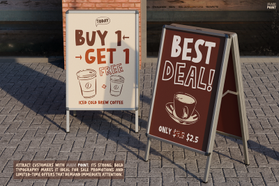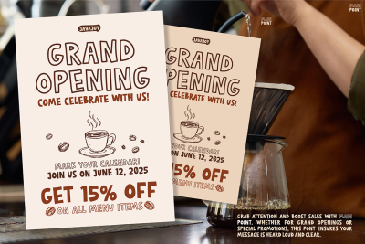 Main Point works especially well in modern marketing and social content. For example, as shown in the Instagram and flyer samples, it fits perfectly with coffee themes and lifestyle messaging. Additionally, the bold letters contrast beautifully with light backgrounds, making every post more eye-catching. It is ideal for headlines, announcements, quotes, and promotional materials. Thanks to its soft edges and hand-drawn look, it delivers a relaxed yet confident tone. Consequently, it adds joy to your words while keeping them readable and bold.
