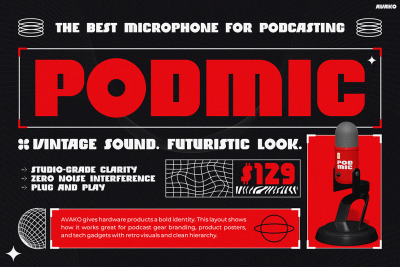 To begin with, AVAKO thrives in any visual project that demands presence, personality, and punch. Designed with purpose, every glyph feels sturdy and impactful, making it ideal for layered layouts or dynamic titles. Furthermore, its retro-futuristic essence ensures it works equally well across both nostalgic and forward-looking designs. For example, you can see how the font powers the โPODMICโ layout with clarity, then shifts effortlessly into the high-tech vibe of โRETRO FUTURISMโ and โDIGITAL POWER.โ Thus, it adapts beautifully to different creative environments.