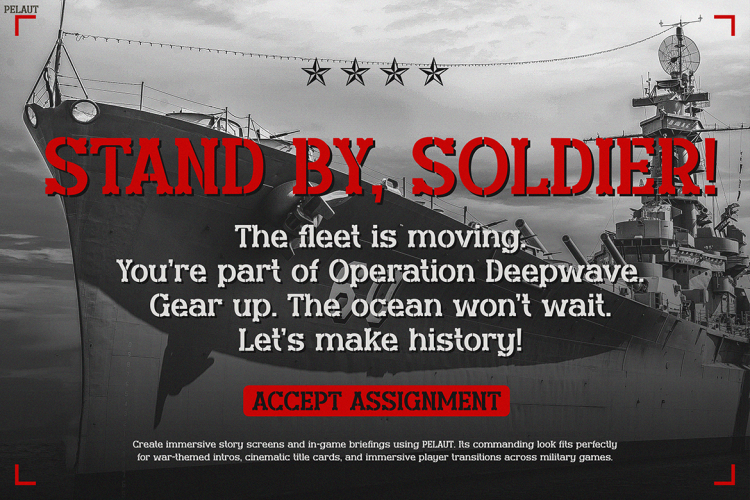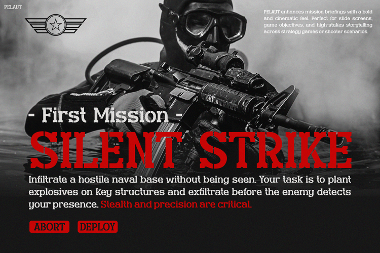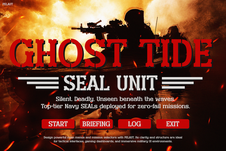 Whether you’re launching a naval combat game like SEA WARZONE 7 or creating a stealth mission experience in SILENT STRIKE, PELAUT amplifies the mood and immerses players in your game’s narrative. It doesn’t just look good—it brings cinematic weight and urgency to every screen. Use it in main menus, mission briefings, log screens, or promotional posters to instantly convey strategy, danger, and action.
