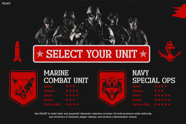 Gaming Font PELAUT serves game developers, UI designers, and branding specialists working on military, tactical, or shooter-themed projects. Indie developers can build immersive, gritty war games, while AAA studios can use it to boost visual storytelling with style and authority. Content creators will also benefit—use PELAUT in YouTube thumbnails, Twitch graphics, and social media promotions to stand out in crowded feeds.