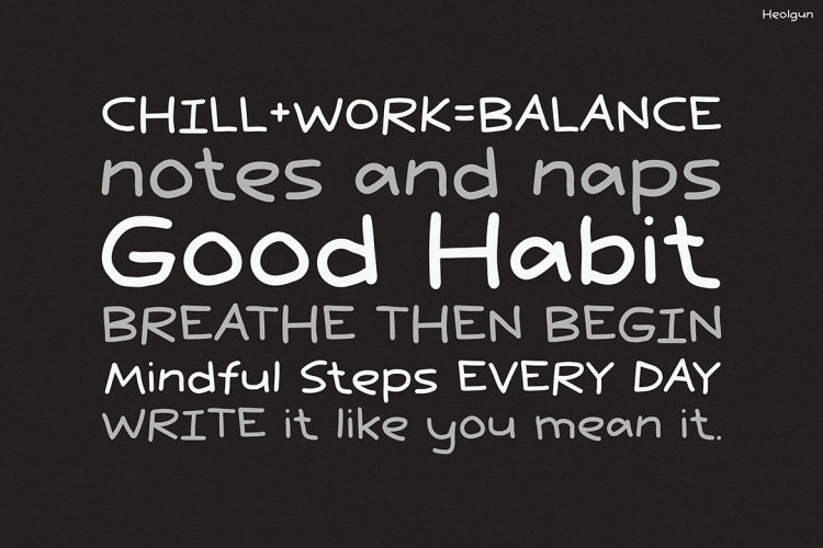 Handwriting Font Heolgun is a handwritten display font that brings warmth, clarity, and charm to your words. Its rounded edges and slightly imperfect strokes give it a human and friendly personality. As a result, it feels like a real note from a friend rather than a cold, digital typeface.