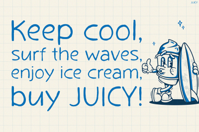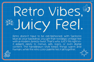 Handwriting Font Juicy starts with a delightful twist. Furthermore, it blends retro vibes with a modern, breezy flair. This, in turn, sets it apart in typography. Its hand-drawn charm features playful curves and clean lines. Additionally, it exudes a nostalgic Santorini blue backdrop. Moreover, the font merges vintage aesthetics with a fresh, juicy feel. Consequently, it adapts easily to various projects. Bold letters come with whimsical stars and doodles. As a result, this creates a warm, human touch. Likewise, the retro color palette ties it together. Therefore, it enhances menus, ads, logos, and digital content. Ultimately, the design transforms ordinary pieces into standouts. In addition, itโs a top choice for personality and nostalgia.