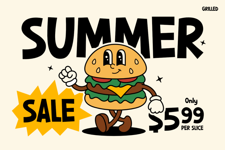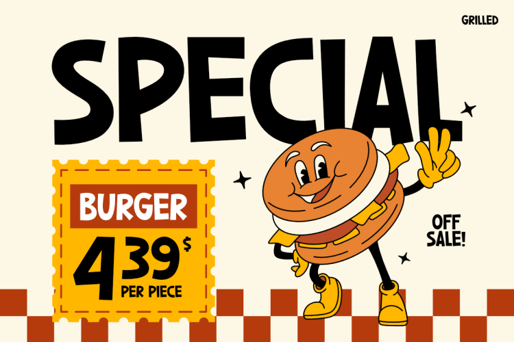 Consequently, Instagram Font GRILLED becomes a powerful tool for brands and creators who want a typeface that balances fun and professional appeal. Even so, the font remains versatile enough to support various themes, including food promotions, summer sales, restaurant menus, and cheerful marketing materials. In addition, the preview imagesโfeaturing adorable burger mascots, dancing tacos, and smiling friesโdemonstrate how effortlessly the font blends with cartoon-style artwork and bold color palettes. Therefore, it supports creative storytelling while keeping every design fresh, engaging, and easy to enjoy.