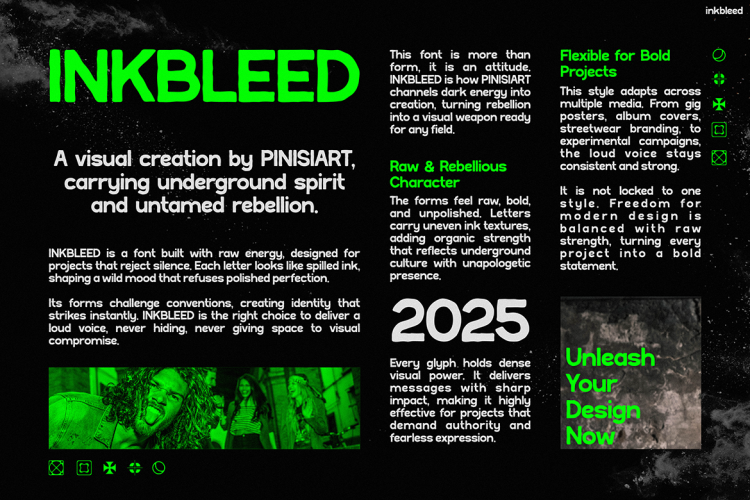 In addition, event organizers, rock festivals, or marketing campaigns can rely on its bold energy. Above all, Inkbleed doesnโt whisperโit roars.