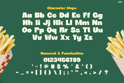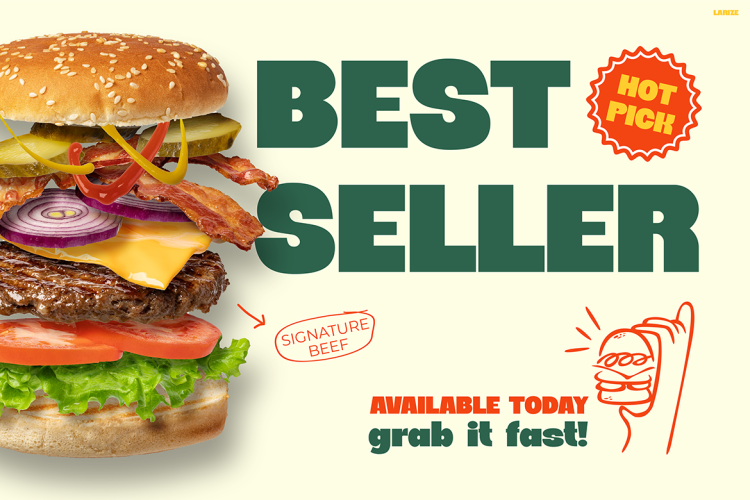 Instagram Font LARIZE also delivers remarkable versatility. Furthermore, its balanced proportions and smooth outlines make it suitable for both digital and printed media. Even so, the font maintains a warm and friendly character, which helps food brands appear more inviting and delicious. In addition, its bold display style strengthens brand identity, making products look premium, trendy, and easy to recognize. Consequently, designs become more engaging, especially when promoting burgers, burritos, hot dogs, coffee, or bakery items.