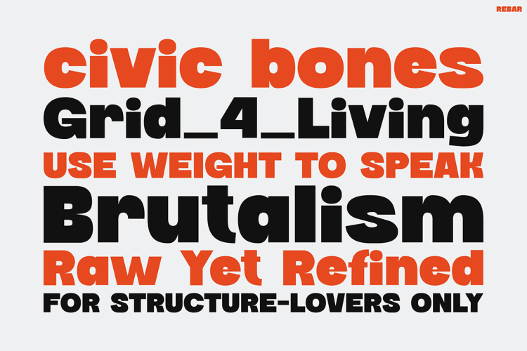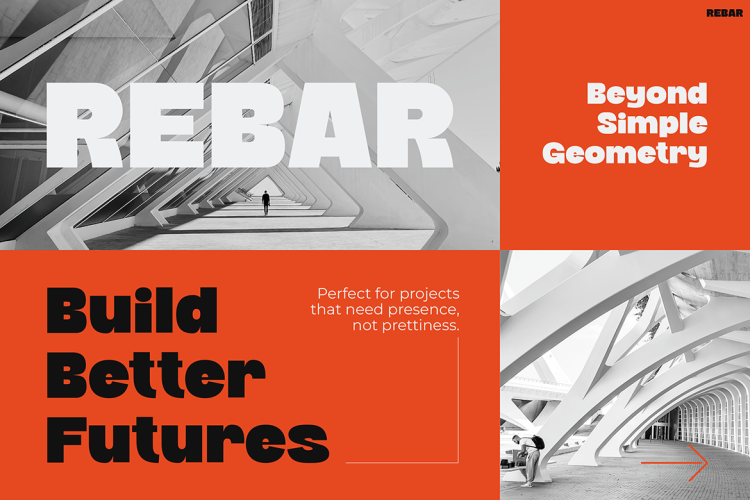 In addition, REBARโs stylized structure fits perfectly with forward-thinking layouts. Whether used in editorial spreads or presentation slides, its dynamic character makes every headline feel intentional. Beyond aesthetics, its functionality also shinesโdelivering high legibility even in complex compositions.