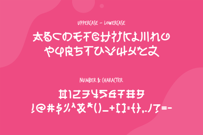 Sunrize is versatile for digital and print uses. It stands out on vibrant backgrounds and pairs well with colorful illustrations, adding a playful touch. With its clear and simple design, Sunrize works well in various text sizes, making it suitable for both titles and small labels. The lively, accessible style captures attention, making it ideal for engaging designs. Its Japanese-inspired look offers a cultural hint that feels modern and fresh, appealing to those who enjoy a cute Japanese aesthetic.
