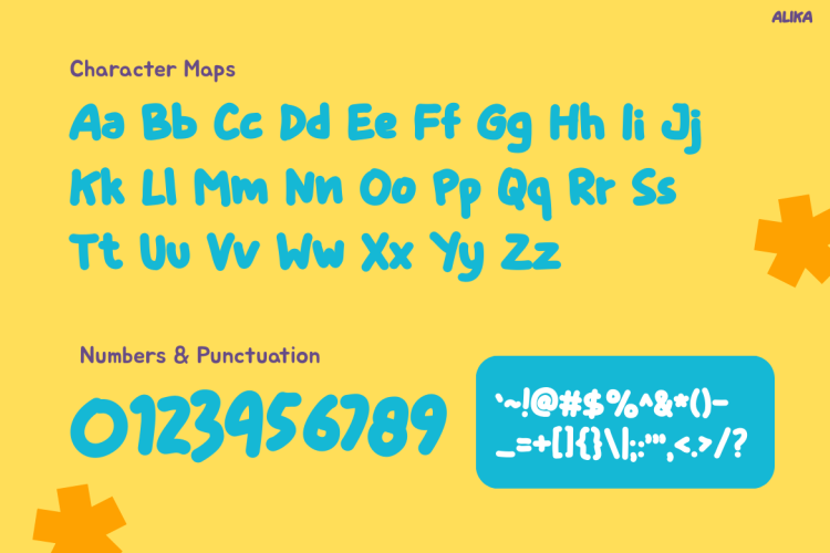 Alika is also built with usability in mind. For example, it includes uppercase and lowercase letters, numbers, and basic punctuation. Because of this, designers can create consistent layouts easily. Furthermore, the bold structure keeps the letters readable at different sizes. Consequently, Kids Font Alika works well for both digital and print use. In short, this font is flexible, practical, and cheerful.