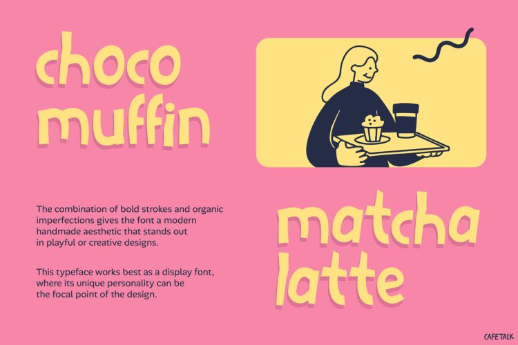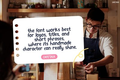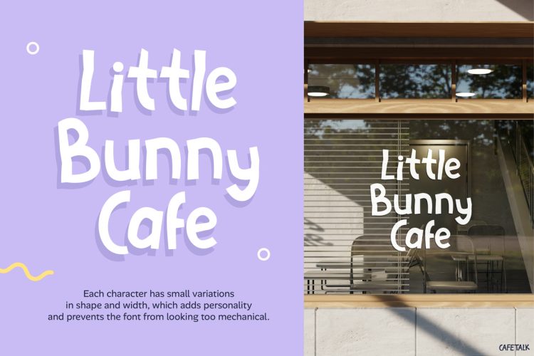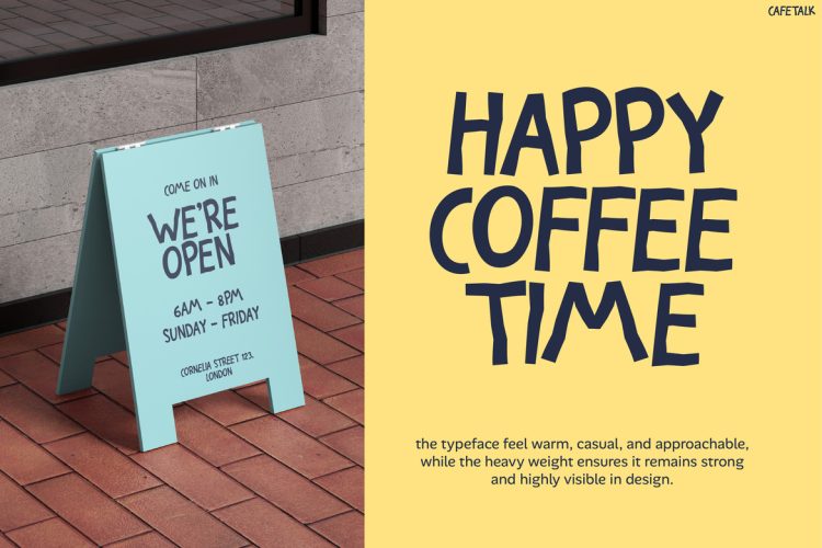 Kids Font Cafetalk is a delightful hand-drawn display font that brings warmth and charm to any design. Moreover, its rounded shapes and bouncy baseline create a friendly and inviting look. In addition, the slightly imperfect strokes give it a natural, human touch. As a result, it stands out from clean, rigid fonts. At the same time, it captures the cozy feeling of a cafรฉ while staying clear and readable. Therefore, each letter feels lively and expressive, and the overall rhythm draws attention without overwhelming the message. Not only that, but it also adds a sense of personality that makes your designs feel more authentic and engaging.