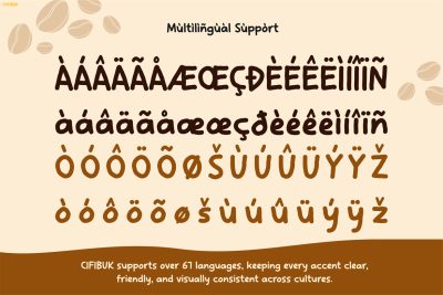 In addition, Kids Font COFIBUK draws inspiration from cafรฉ culture, handmade packaging, and everyday creative moments. For this reason, the letter shapes feel relaxed and cheerful, helping messages connect emotionally with viewers. Moreover, the font keeps visual weight consistent, so designs stay clean and easy to scan. Not only that, it supports 67 languages, allowing creators to reach global audiences with one unified style. Whether used in print or digital formats, this font keeps designs friendly, expressive, and reliable.