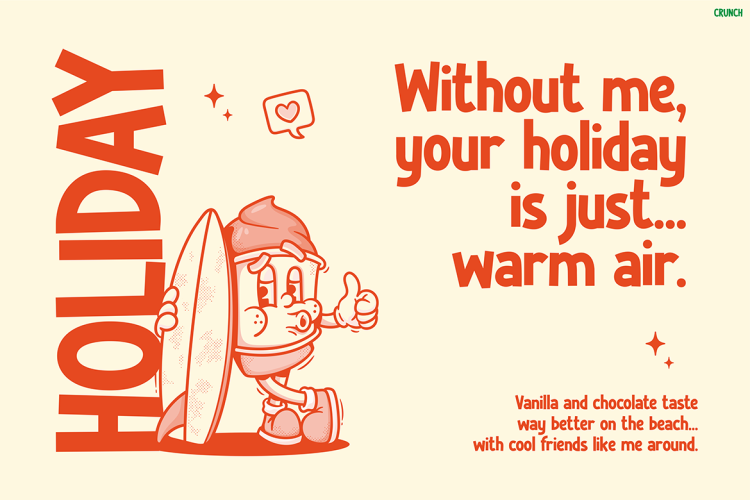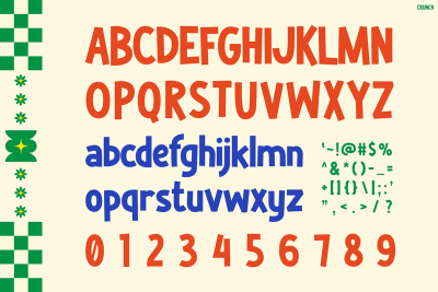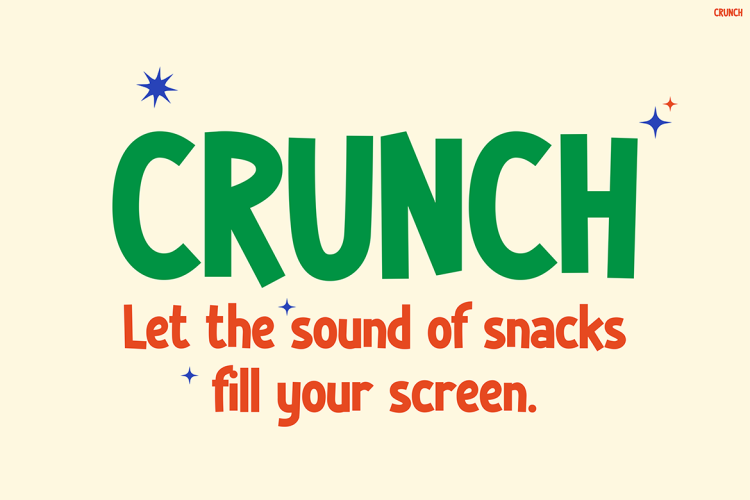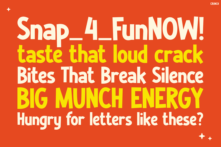 Kids Font CRUNCH is a bold, cheerful typeface designed to bring retro joy into your modern-day designs. With thick, rounded edges and a high-contrast look, it adds instant energy while staying warm and friendly. Inspired by classic snack packaging, old-school diner signage, and cartoon titles, it creates an engaging vibe that feels nostalgic yet fresh.