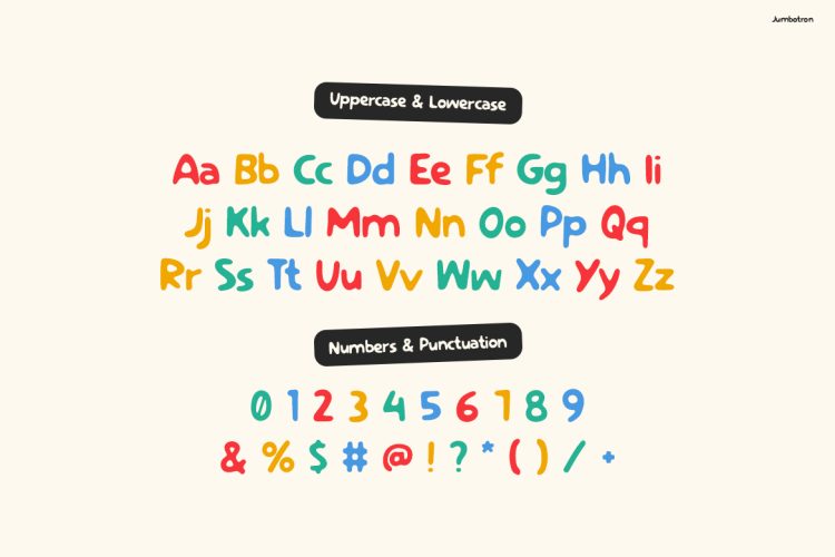 This font is ideal for graphic designers, illustrators, and content creators. Specifically, it suits childrenโs brands, toy packaging, and educational materials. Moreover, it works great for kids’ clothing, storybooks, and playful merchandise. In fact, it is perfect for anyone who wants to create fun, bright, and memorable designs. Because of its friendly style, it connects easily with young audiences. So, if your project needs a joyful and bold visual tone, Jumbotron is a strong choice.