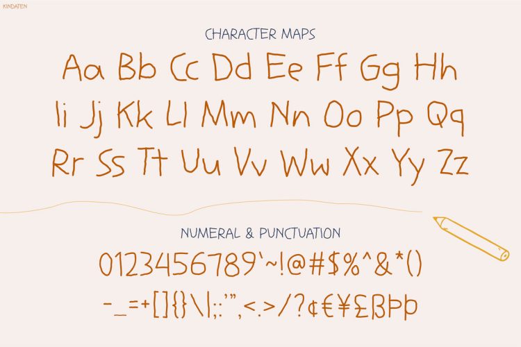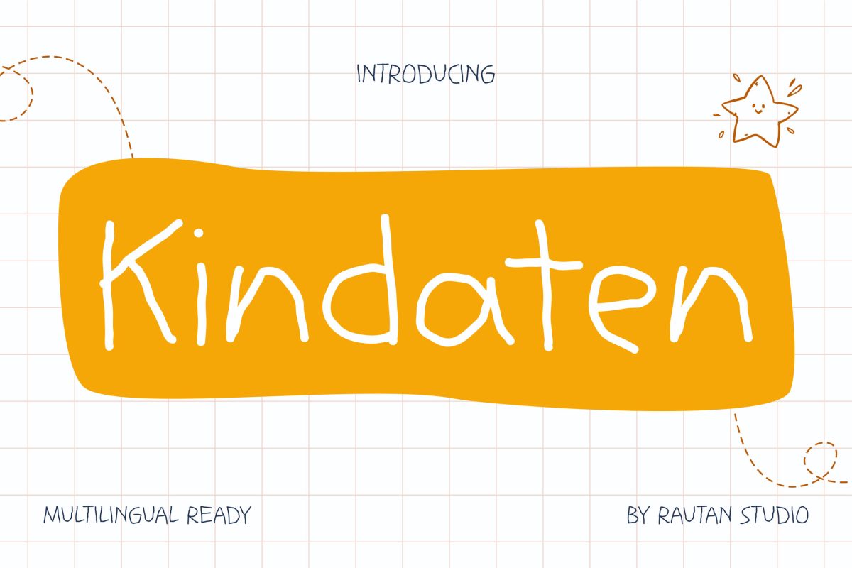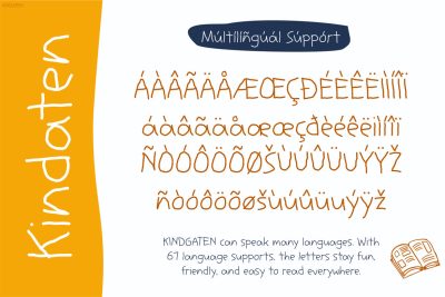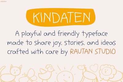 Kids Font Kindaten is ideal for childrenโs book authors, educators, teachers, tutors, and parents creating learning materials. It also fits kids brands, toy packaging, school events, educational apps, daycare promotions, and happy social media content. Additionally, it works well for greeting cards, kids posters, early learning worksheets, and friendly branding projects that need a soft and joyful voice.