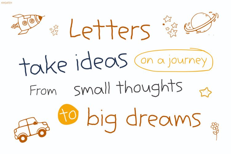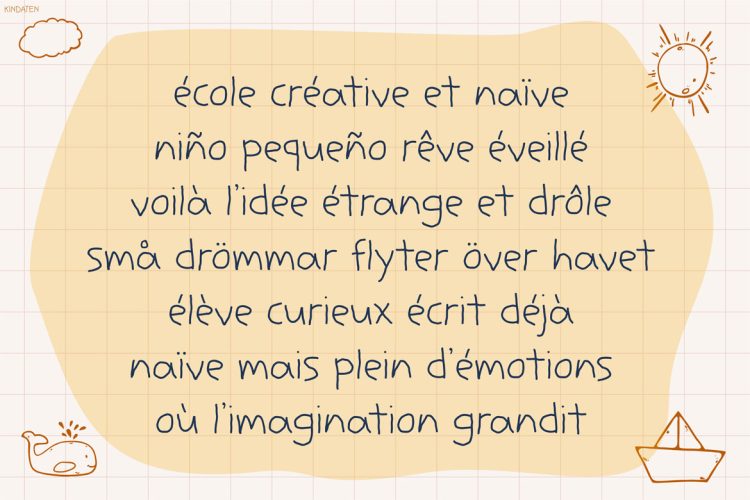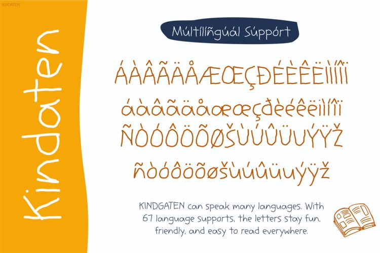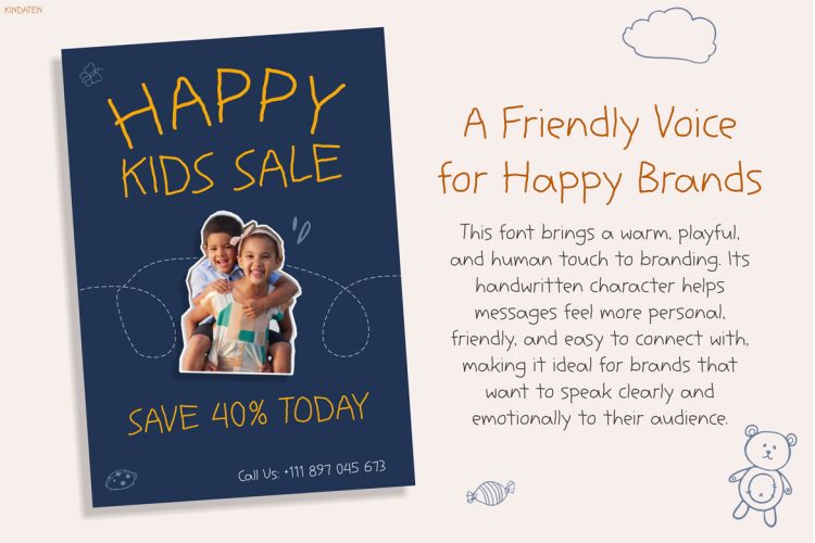 Kids Font Kindaten combines a childlike handwritten style with thoughtful design details that support clarity and usability. Each letter feels as if it was drawn with care, using smooth curves and slightly playful inconsistencies that add charm without hurting readability. Moreover, the font works well across many formats. You can use it for posters, worksheets, storybooks, learning materials, classroom decorations, packaging, and digital content. Because the letterforms stay clean and open, children can recognize words easily. At the same time, designers benefit from a font that feels warm and professional. The multilingual support also makes it suitable for global brands, schools, and creators who need flexibility without sacrificing style.