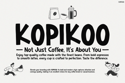 Kids Font KOPIKOO is a playful, bold, and attention-grabbing typeface that brings joy and personality to any design. With its chunky curves and hand-drawn look, KOPIKOO exudes warmth, friendliness, and authenticity. This font is perfect for creating a cozy and fun vibe, whether itโs for coffee cups, storefronts, or product packaging. Its bold and legible letters make it ideal for display purposes, while the quirky letterforms add character to any visual. Not just visually striking, Kids Font KOPIKOO is highly versatileโit seamlessly balances charm and clarity, making it stand out without overwhelming your design.