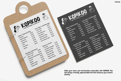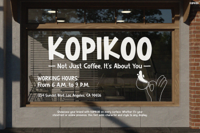 The charm of KOPIKOO lies in its organic, slightly imperfect strokes that mimic a child’s playful doodle. However, the clever design ensures it maintains readability at all sizes. The letters feel alive, inviting readers to feel more connected to the brand or message. Used on signage, cups, or digital banners, this font turns every surface into a memorable brand statement. Because it fuses aesthetic appeal with practicality, KOPIKOO isnโt just a fontโitโs a voice for fun, relaxed, and people-first branding.