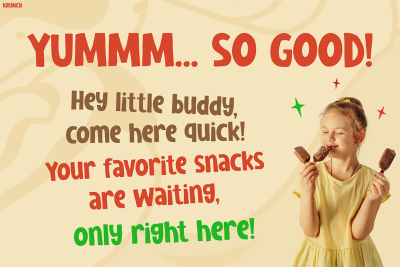 The visuals of Kids Font KRUNCH show exactly why it stands out. From the bold “KRUNCH” title in crisp, bite-sized letters to its highly legible alphabet set (uppercase, lowercase, numbers, and punctuation), the font is crafted to grab attention while staying readable. The aesthetic is lighthearted and full of joy—ideal for brands or creators that want to express youthful energy, crunchy textures, and snack-time excitement. It feels both fresh and nostalgic, reminiscent of weekend cartoons, lunchbox treats, and after-school fun.