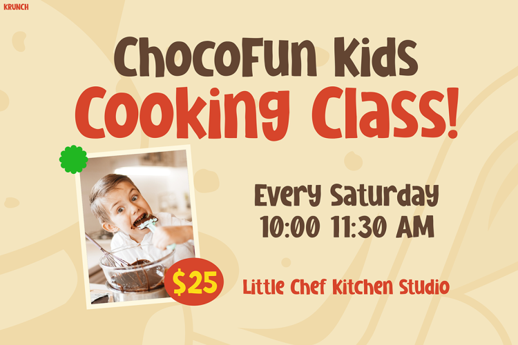 Children’s Cooking Events: The “ChocoFun Cooking Class” sample proves this font fits perfectly in activity flyers or school programs.