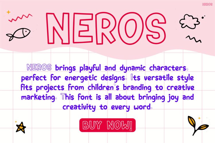 Kids Font NEROS is perfect for designers, content creators, and brands that target kids, families, and playful audiences. It works especially well for childrenโs branding, birthday invitations, school projects, party posters, and educational materials. In addition, it suits social media graphics, merchandise, packaging, and creative campaigns that aim to feel friendly and modern. Small businesses, event organizers, and creative studios can also rely on NEROS to create cheerful branding that feels memorable and fun. Because of its versatility, both beginners and professional designers can use this font with confidence.