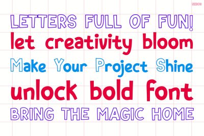 Kids Font NEROS bursts onto the screen with bold outlines, cheerful shapes, and a lively personality that instantly grabs attention. From the first glance, this font feels fun, expressive, and full of imagination. Its unique outline-and-filled style creates visual contrast that makes every word pop, while still staying clean and readable. Because of its rounded forms and friendly proportions, NEROS feels approachable and joyful. At the same time, its strong structure keeps designs clear and impactful. As a result, this font works beautifully for both playful headlines and eye-catching statements. Moreover, the character set feels balanced and consistent, which helps designers build cohesive visuals across different media. Overall, NEROS stands out as a font that combines fun aesthetics with practical function.