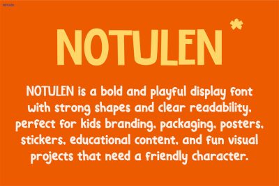 Furthermore, Notulen draws inspiration from imagination and childhood energy. Thick strokes create strong visual impact right away. At the same time, soft curves add a cheerful and approachable feel. Therefore, the font feels playful while staying easy to read. Not only does it perform well at large sizes, but it also remains clear at smaller scales. Consequently, Kids Font Notulen helps messages feel positive, friendly, and confident.