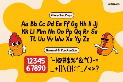 Kids Font Oktabroom is perfect for designers working on fun-focused projects. It fits food branding, kids menus, snack packaging, and fast-food promotions. It also works great for food trucks, restaurant signage, and discount banners. In addition, this font suits childrenโs events, school posters, and birthday invitations. Teachers and educators can use it for classroom visuals. Content creators and small businesses will find it easy to apply. Anyone who needs bold, happy visuals can rely on Oktabroom.