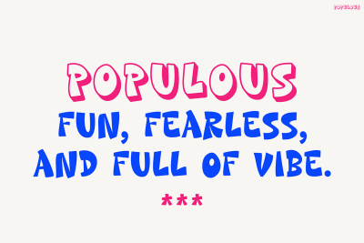 Each image shows how Populous thrives in loud, energetic themes. It can be playful like bubblegum or bold like graffiti, depending on how you use it. Because of its thick structure and attention-grabbing form, it’s perfect for big headlines, expressive logos, or social media visuals that need to stand out.