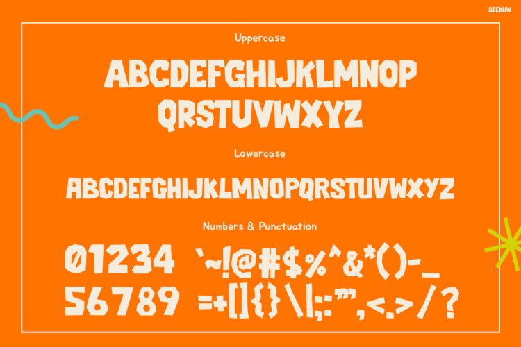 SEEKUW is built for expressive display use. First, it performs strongly in headlines and posters. Additionally, it works well for packaging and branding visuals. The font includes uppercase letters, numbers, and essential symbols. Because of this, it supports real design needs. Moreover, its cartoon-inspired style feels friendly and modern. However, it still maintains a bold presence. Furthermore, the rugged edges add texture without reducing clarity. As a result, Kids Font SEEKUW feels lively and authentic. Meanwhile, its strong structure ensures consistent results across print and digital media.