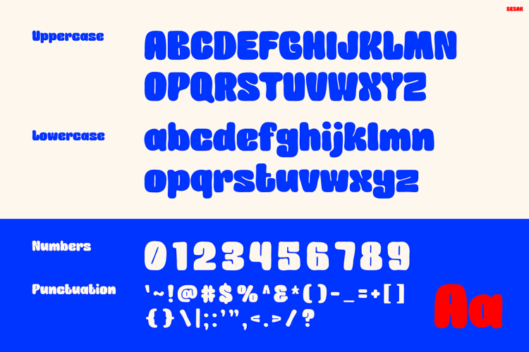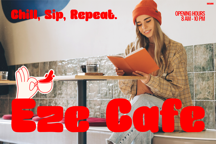 SESAK offers a bright and cheerful personality that elevates your visual storytelling. Additionally, its thick strokes and soft, rounded letterforms help your designs stand out, especially when paired with vibrant backgrounds or expressive illustrations. The font feels modern yet nostalgic, giving you a retro-inspired look that still feels fresh. Consequently, it becomes ideal for menus, product advertisements, cafรฉ promotions, childrenโs visuals, and fun branding concepts.