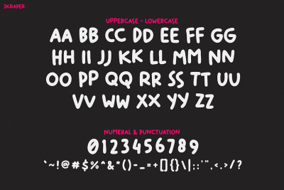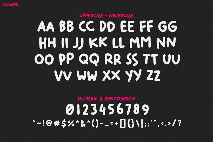 Kids Font SKRAPER is a playful and modern typeface. It blends street culture with bold, fun design. The letters are chunky, round, and full of attitude โ perfect for grabbing attention. This font is also a fantastic tool for educators and publishers working on materials for older children and tweens who want something bold and different from traditional childlike fonts