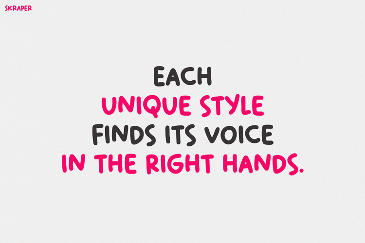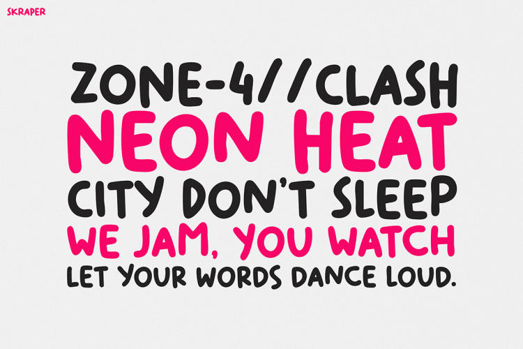 As a result, SKRAPER is perfect for posters, branding, T-shirts, or media aimed at kids. Wherever bold style is needed, this font adds personality. Itโs funky, loud, and confident โ just like the young audiences itโs made for.