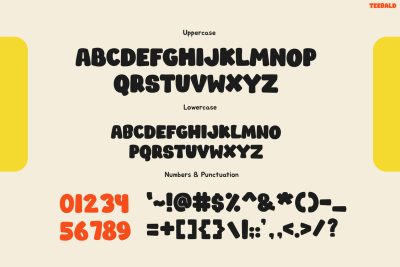 TEEBALD is the perfect choice if you want typography that feels bold, playful, and unforgettable. Bring vibrant energy to your designs and make every headline pop with personality. Add Kids Font TEEBALD to your collection today and turn ordinary text into exciting visual statements.