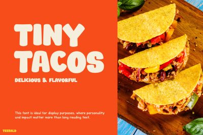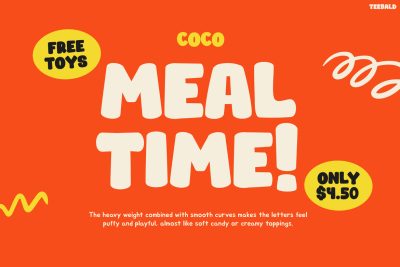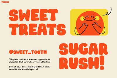 TEEBALD features thick, rounded characters that create a bold and playful visual style. The letter shapes feel smooth and bouncy, giving designs a cheerful tone that stands out immediately. Moreover, the font pairs beautifully with bright colors, cartoon illustrations, and fun shapes. Because of its strong personality, it works perfectly for eye-catching headlines, kids menus, posters, and promotional graphics. In addition, the bold style ensures excellent readability even at large sizes. This makes it ideal for titles, packaging labels, signage, and social media designs. With its lively appearance, Kids Font TEEBALD helps designers create visuals that feel dynamic and full of positive energy.