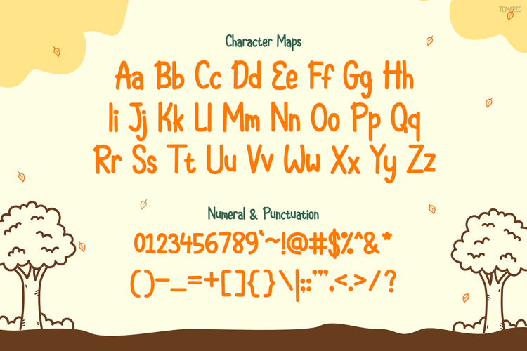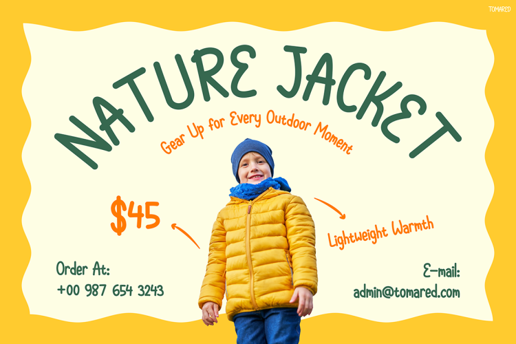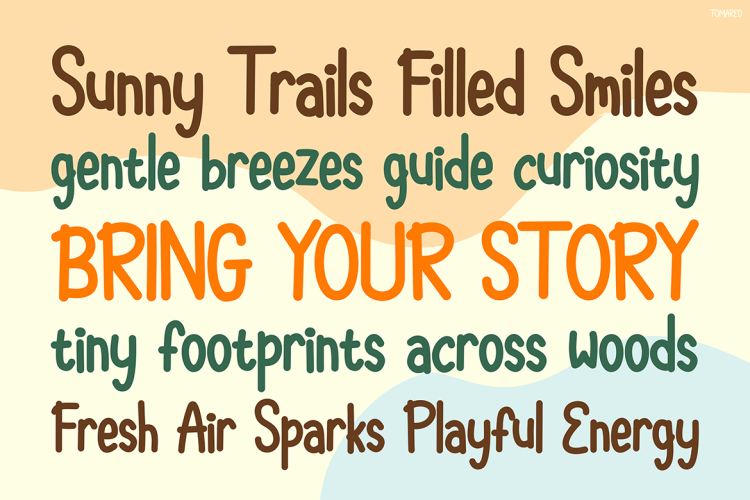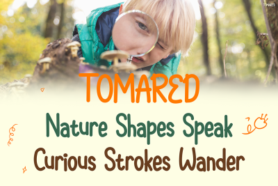 Consequently, TOMARED fits many uses such as posters, school projects, kidsโ event banners, product labels, or playful brand identities. Moreover, it carries an outdoor and adventure tone, which makes it ideal for nature-themed visuals. As a result, the font turns simple messages into warm, exciting stories that connect with kids and families.
