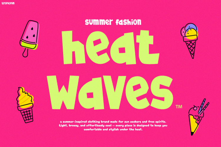 What makes it truly stand out is how it balances fun and functionality. The chunky yet soft letterforms make your text pop with energy, yet remain beautifully legible across posters, packaging, and social media. In addition, its cheerful design captures attention immediately and keeps the viewer engaged. From the vibrant โheat wavesโ headline to the adorable โfruity popsicleโ tubs, every use of Tropicfun feels refreshing and full of life. Therefore, itโs not just a fontโitโs a feeling, a smile, and a joyful burst of creativity that transforms words into a tropical celebration.