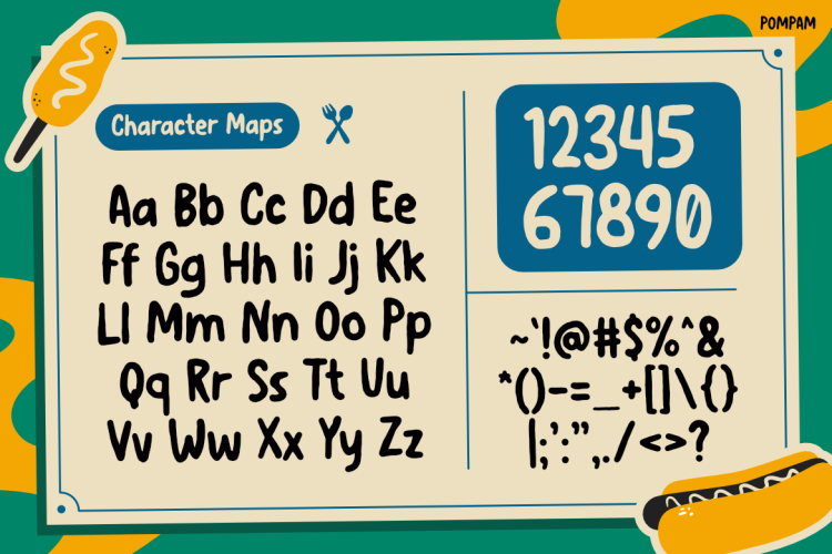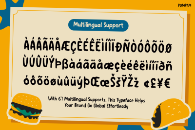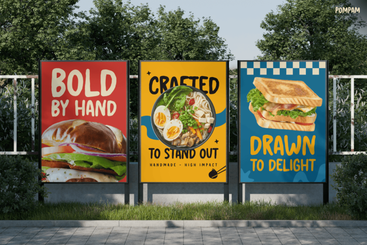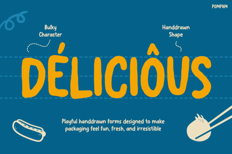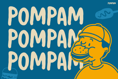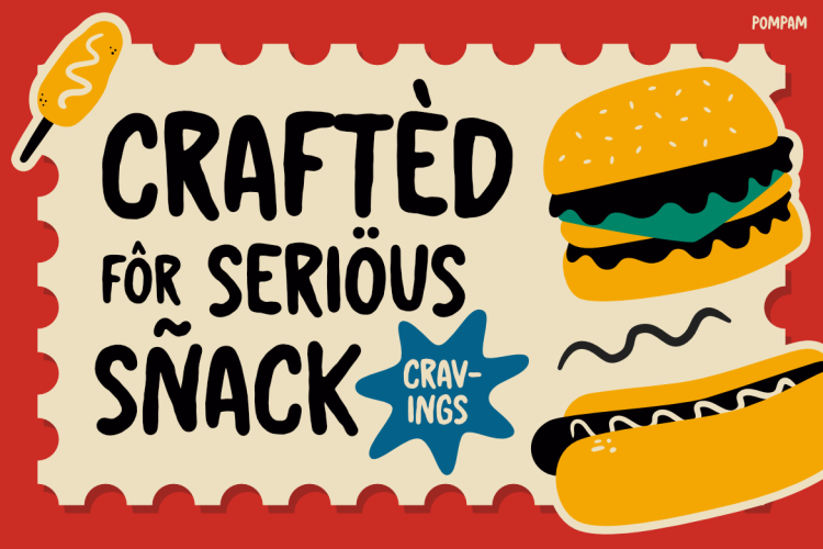 Modern Font POMPAM thrives in bold branding environments. Whether used for snack packaging, cafรฉ menus, beverage labels, or street food visuals, it reinforces flavor-driven identity. Likewise, it performs exceptionally well in childrenโs products, merchandise, social media graphics, and promotional posters. Because of its vibrant structure, it enhances shelf presence and digital visibility simultaneously.
