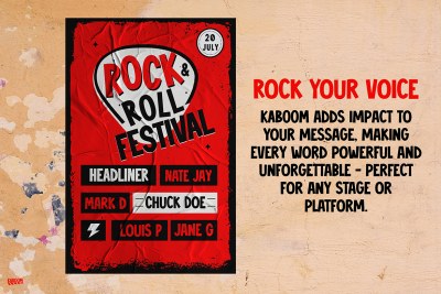 Moreover, concert organizers, music festival promoters, and event venues will find KABOOMโs bold design effective for promotional materials. Its dramatic letterforms are ideal for flyers, banners, and digital promotions, ensuring that your event stands out and attracts audiences.