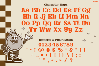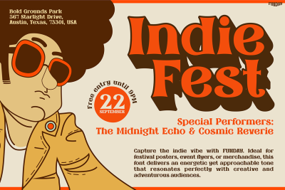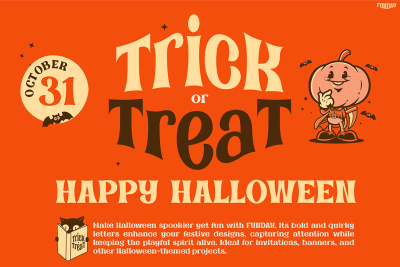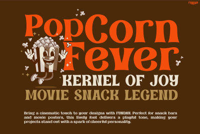The designers crafted FUNDAYโs character set to ensure maximum legibility while preserving its quirky and fun appeal. Its bold weight and clean structure suit headlines, logos, or branding that demand attention. Warm, rounded edges and balanced proportions give it a friendly vibe, while subtle decorative details add a touch of retro charm. Whether paired with modern graphics or used to recreate a classic 70s look, FUNDAY turns any project into a visual delight.
