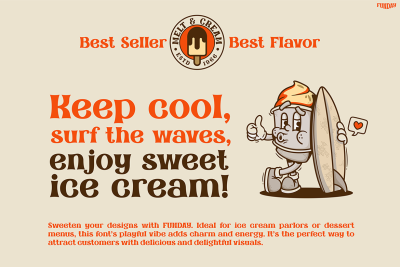 Event organizers hosting retro-inspired gatherings or kid-focused events can rely on FUNDAY to set the mood. Food brands, such as bakeries, cafes, or confectioneries, can use this typeface to convey warmth and joy. Craft enthusiasts and hobbyists will also enjoy working with FUNDAY for DIY projects, personalized gifts, and home decor.