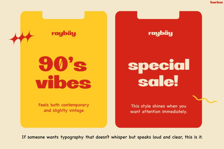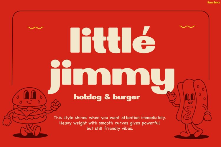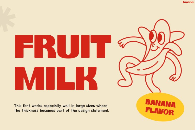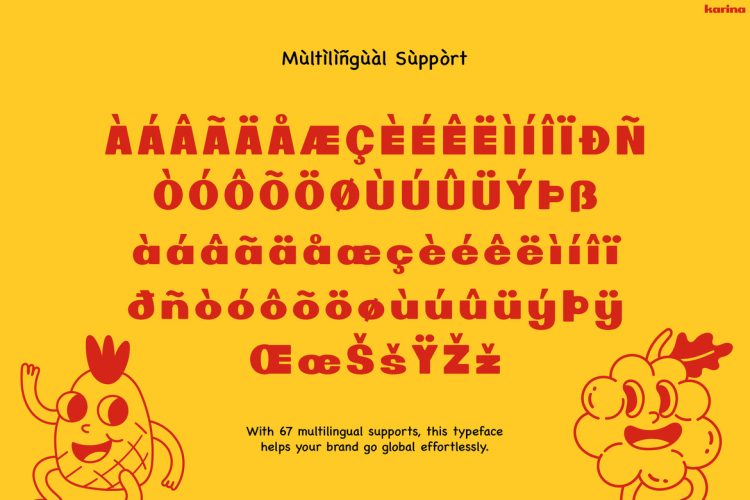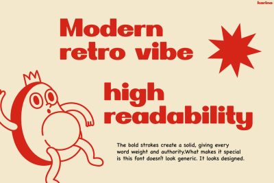 KARINA is ideal for designers, brand creators, and content makers who want to create playful and standout visuals. It works exceptionally well for childrenโs products, food and beverage branding, posters, social media graphics, merchandise, retro-themed projects, and advertising campaigns. If your goal is to evoke happiness, energy, and a touch of vintage charm, KARINA is the perfect choice.