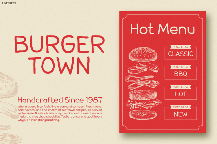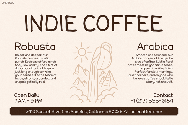 Retro Font Linepress is the go-to choice for designers, entrepreneurs, and makers who value authenticity in their visuals. Itโs perfect for branding projects that aim to tell a storyโfrom coffee shops and outdoor brands to minimalist lifestyle products. If your project needs a sense of warmth, freedom, or crafted elegance, Linepress helps you express it beautifully.