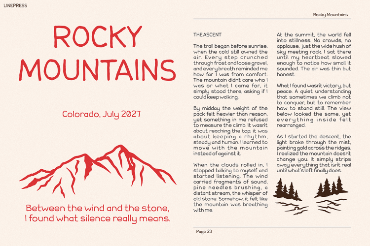 Retro Font Linepress is a beautifully balanced monoline handwritten sans font that blends nostalgic charm with clean modern geometry. Its crafted lines breathe life into every letter, evoking a sense of storytelling and adventure. Inspired by classic outdoor signage, vintage camp posters, and handcrafted diner menus, Linepress delivers a uniquely organic feel thatโs both minimal and expressive. Every curve and stroke in this typeface feels intentionalโmade to capture the warmth of handwriting while maintaining professional clarity.