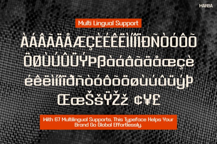 MARBA does not rely on decoration to make a statement. Instead, it uses bold structure and smart geometry to express strength and clarity. The uppercase-driven personality enhances its visual punch, while its clean cuts keep compositions modern and professional. Furthermore, MARBA supports 67 languages, allowing global brands to communicate consistently across markets without losing visual identity. Whether placed on posters, product packaging, digital banners, or editorial covers, MARBA maintains clarity and dominance across every medium.