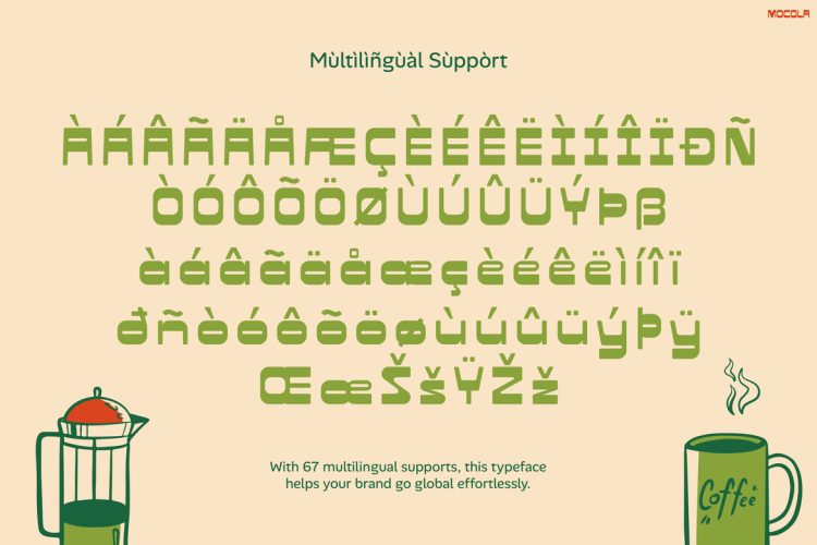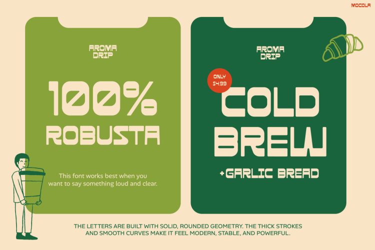 Retro Font MOCOLA is ideal for coffee shops, cafรฉs, food and beverage brands, and lifestyle products. Additionally, it works beautifully for packaging designers, branding agencies, and creative entrepreneurs who want a retro yet fresh identity. It is also perfect for menu designs, product labels, posters, merchandise, and social media content. Meanwhile, businesses aiming to build a cozy, handcrafted, and approachable brand image will find this font especially effective.