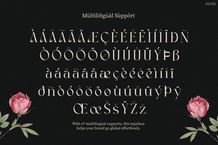 Retro Font Utopia delivers a refined vintage aesthetic that blends timeless elegance with strong editorial character. Inspired by classic fashion typography and artistic print design, this font combines confident vertical strokes with graceful curves. As a result, it creates a striking balance between strength and sophistication. The letterforms feel bold yet delicate, which instantly elevates headlines and branding visuals. Moreover, its stylish proportions and artistic details make every composition look polished and expressive. Because of its distinctive design, Retro Font Utopia transforms simple text into captivating visual storytelling. In addition, the font performs beautifully across both digital and print layouts. With support for 67 languages, designers and creators can communicate with elegance while reaching a global audience.
