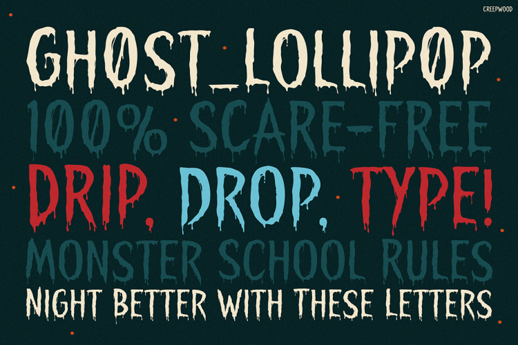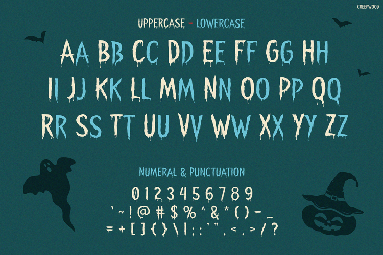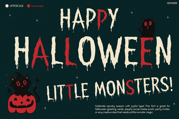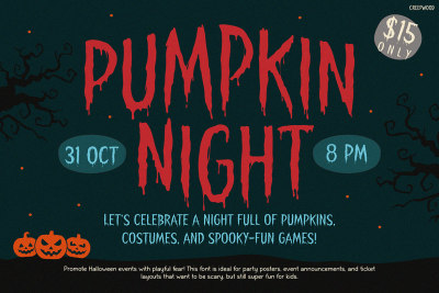 The Creepwood font is ideal for designs that aim to be hauntingly fun. For example, itโs perfect for Halloween party invitations, school event posters, kidsโ streaming series titles, or pumpkin night promotions. Even better, itโs playful enough for childrenโs content while still delivering the thrill factor adults will appreciate. Since each character looks like it’s dripping with fresh blood, your design will feel alive โ or perhaps undead!