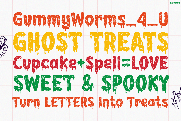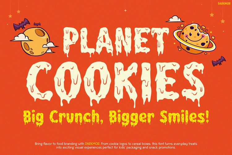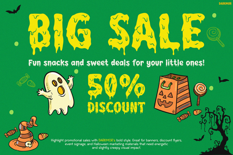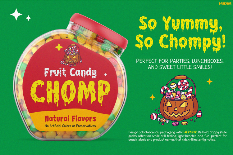 Designers and Creatives: DARKMOR is great for graphic designers who need a bold and playful typeface. For example, it works well for candy labels, party invites, or product packaging. If your project needs a spooky edge with a kid-friendly vibe, this font fits perfectly.