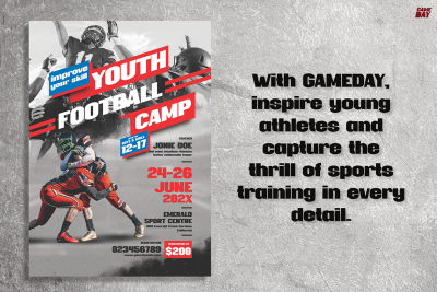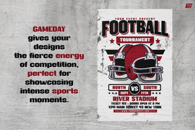 Additionally, this font works well for fitness and gym promotions. Fitness studios, gyms, and trainers can use it for motivational posters, schedules, branded gear, and signage. Its assertive style reflects strength and resilience, inspiring audiences to reach their goals. Whether on social media or within a fitness studio, Sport Font Gameday effectively delivers messages of power and endurance.