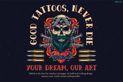 The tattoo font INKOS is a bold and dramatic typeface that is designed to make a strong statement. With its sharp, angular edges and intricate details, it perfectly captures the rebellious and artistic essence of tattoo culture. Moreover, the deep red tones and Gothic-inspired design lend it a timeless yet edgy appearance, making it ideal for projects that require a balance between tradition and modernity. In addition to its striking visual elements, the floral motifs, particularly the roses paired with the skull, evoke themes of life, death, and beauty, creating a visually compelling harmony. Therefore, INKOS is not just a typeface but also a storytelling element that adds depth to your design.