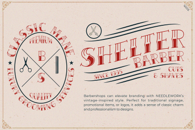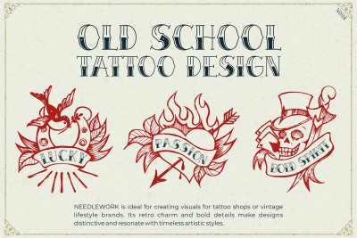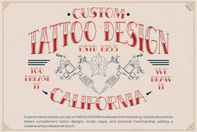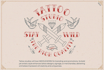 The typeface is not only visually striking but also highly adaptable. It excels in projects tied to tattoo culture while also fitting broader creative needs. By blending boldness with refinement, it appeals to a range of aesthetics, from edgy and rebellious to vintage and elegant. Its unique features make it a great choice for designers looking to stand out.